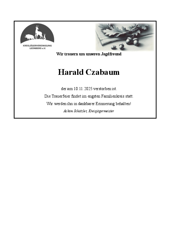 Wir trauern um unseren Jagdfreund Harald Czabaum, der am 10.11.2025 verstorben ist.